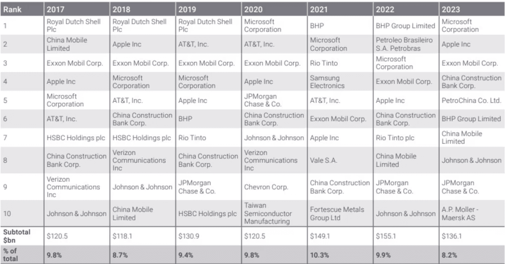 China Construction Bank a JPMorgan Chase se dokonce umístily v první desítce globálních plátců dividend pro rok 2023. Vůbec nejvíce na dividendách vyplatily – možná trochu překvapivě společnosti Microsoft a Apple následované ropným gigantem Exxon Mobil.