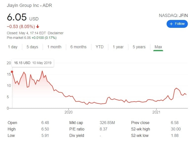 V březnu vzrostla cena akcií Jiayin Group o více než 36 % poté, co se řada finančních poradců na sociálních sítích zmínila o tom, že je společnost značně podhodnocená. P/E jejích akcií se nyní pohybuje okolo 10,17 (což je stále pod konzervativní hodnotovou 15 bodů).