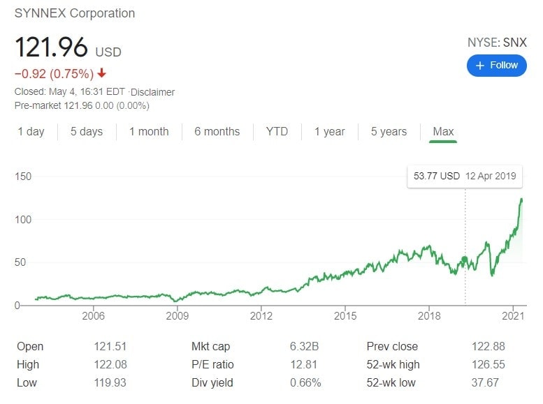 V dubnu společnost oznámila spolupráci s floridskou softwarovou společností Citrix Systems (NASDAQ: CTXS) a technologickou společností Sonim Technologies (NASDAQ: SONM), jejíchž řešení bude SYNNEX nabízet svým klientům. V minulém roce vzrostly jeho výnosy meziročně o 3,87 % na 24,7 miliard dolarů, přičemž P/E jeho akcií je 10,25.