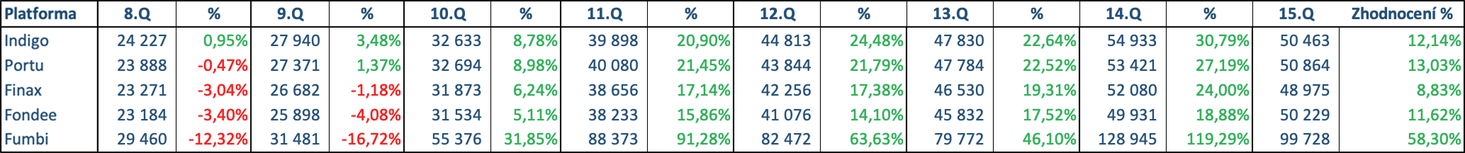 Naopak platformy specializující se na akcie, jako jsou Indigo (také dluhopisy), Portu, Finax a Fondee, vykazují mnohem stabilnější vývoj hodnoty napříč kvartály.