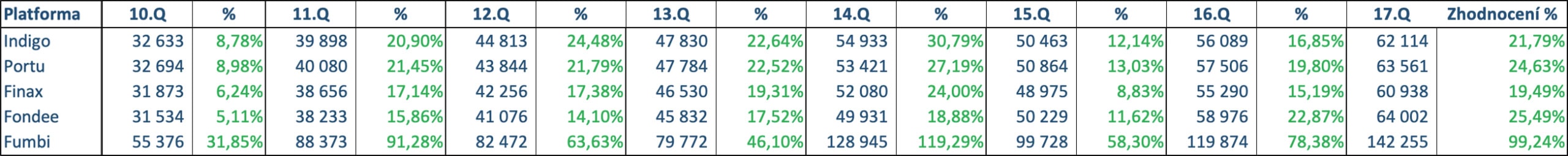 Investice na Fumbi, která je dlouhodobě nejvýkonnější platformou, se v obou z posledních dvou čtvrtletí zhodnotila o více než o 20 000 Kč.