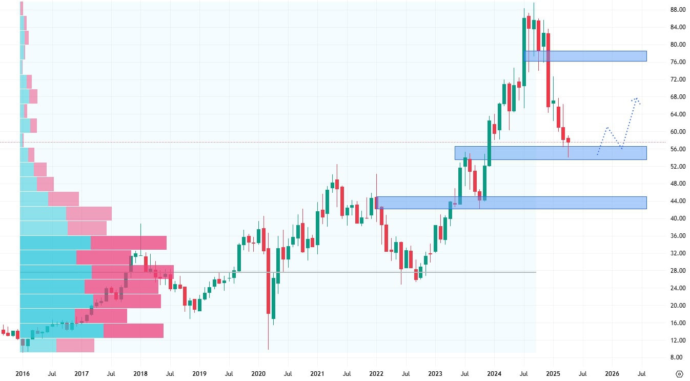 Akcie KB Home se obchodují v rostoucím trendu, ovšem po vytvoření svého cenového maxima výrazně oslabily. Cenový pokles byl prozatím veden pouze na hodnotu nejbližšího supportu na ceně 55 USD za akcii.