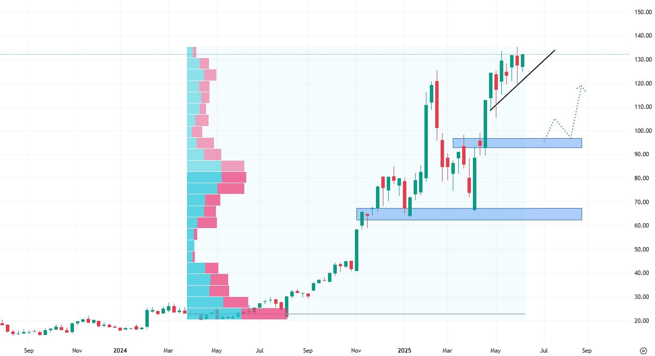 Podle pozitivní cenové predikce mají akcie ještě dostatečný prostor pro svůj cenový růst, ovšem negativní cenová predikce očekává jejich pád dokonce pod hodnotu supportu na ceně 80 USD.