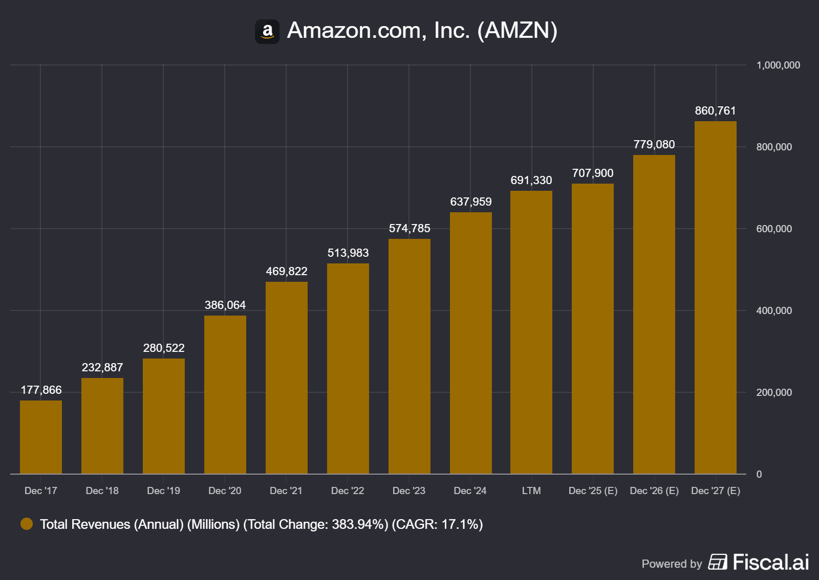 Před Amazonem je Walmart, který společnost pravděpodobně brzy předběhne. Amazon má totiž v roce 2025 dosáhnout tržeb ve výši 700 miliard dolarů.