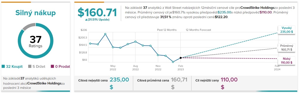 Pozitivní výhledy na růst akcií CrowdStrike přinášejí i analytici z Wall Street, kteří predikují růst akcií až k hodnotě 160 USD, popřípadě až na cenu 235 USD. První cenový cíl se nachází na ceně nejbližší rezistence, která bude trhu bránit v růstu po proražení klesající trendové čáry. Druhý cíl se nachází na cenovém maximu ze začátku roku 2022.