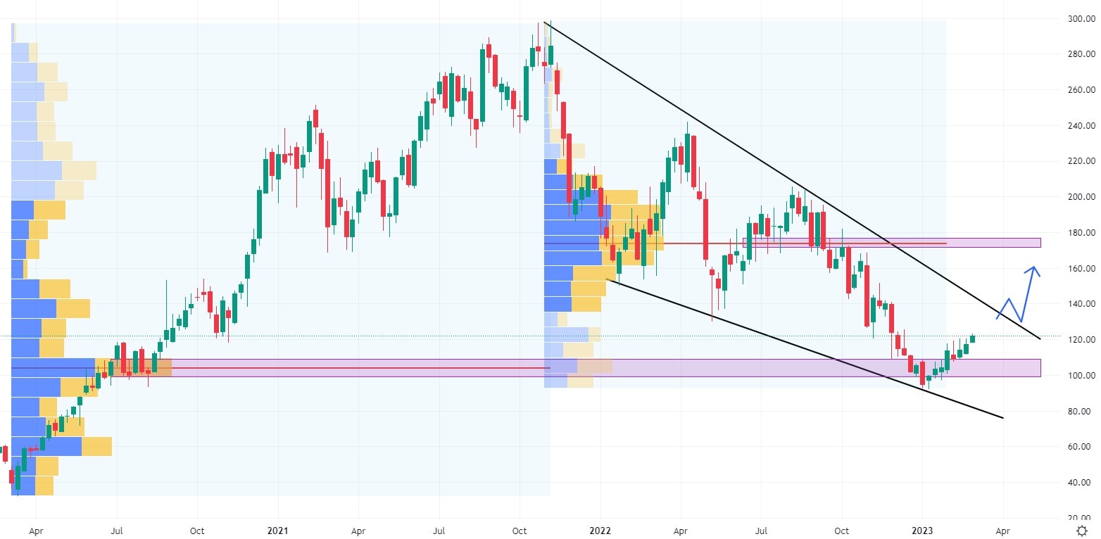Po loňském cenovém propadu se akcie CrowdStrike dostávají opět do hledáčku investorů, protože na týdenním grafu došlo k otestování klesající trendové čáry, která byla v konfluenci s největším volume z roku 2020. Pokud dojde k proražení i horní hrany klesajícího kanálu, bude pozitivní sentiment na těchto akciích potvrzen.