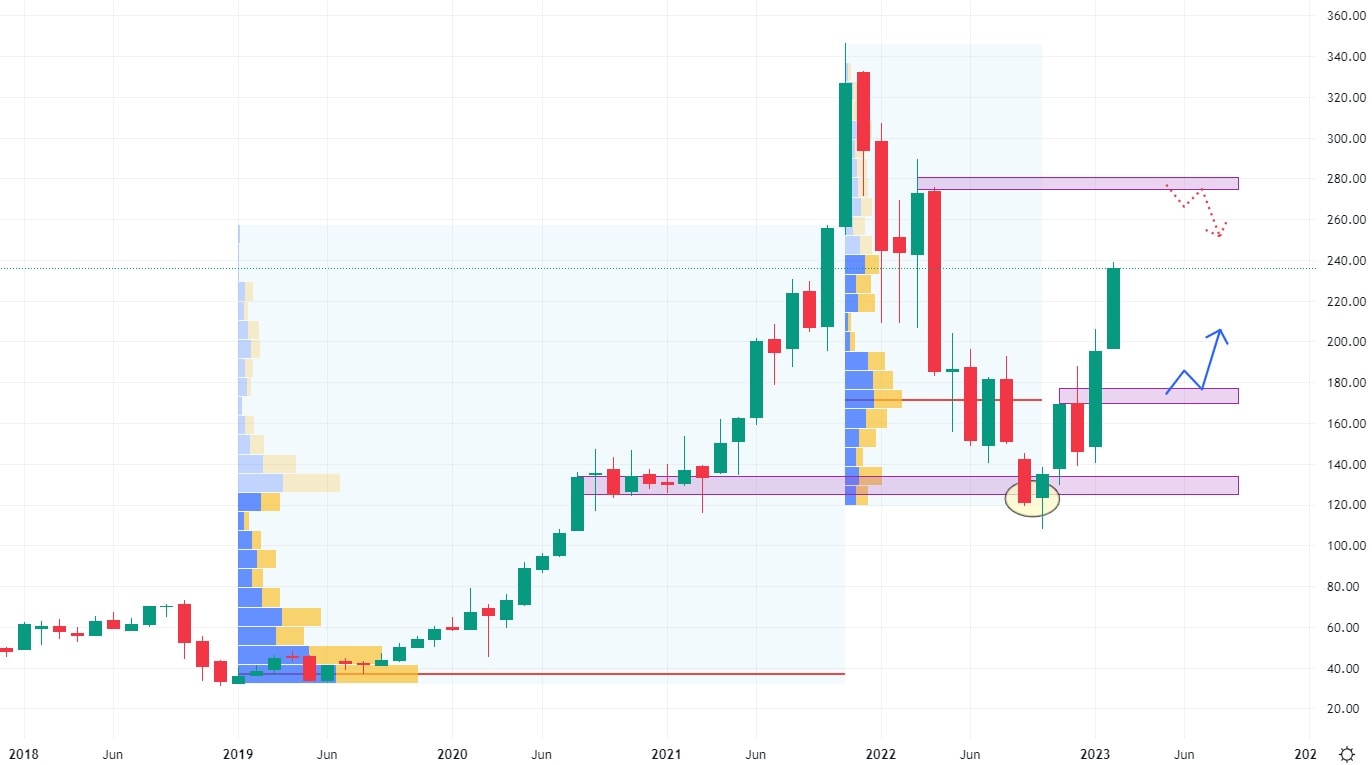 Pozitivní roční hospodářské výsledky a opětovný nárůst zájmu o hry odstartovalo na akciích Nvidia raketový růst. Pouze během prvních tří měsíců letošního roku dokázaly akcie Nvidiaposílit o více než 65 %. Tento růst nastal poté, co trh otestoval supportní zónu s vysokým volume, která bylo nakumulována během růstových let 2020 a 2021. Akcie se nyní ženou k nejbližší rezistenci, která se nachází na hodnotě 280 USD.