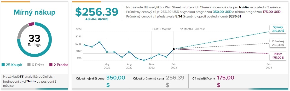 Tato rezistence by podle analytiků měla být pouze přechodnou zastávkou, na cestě akcií ještě výše. Pozitivní výhledy na akcie Nvidia totiž hovoří o atakování ceny 350 USD, což by znamenalo dotažení historických maxim. Této prognóze věří 25 analytiků z 33, kteří se účastnili průzkumu. Konzervativnější výhled hovoří o atakování ceny 256 USD, což je hodnota již zmíněné rezistence.