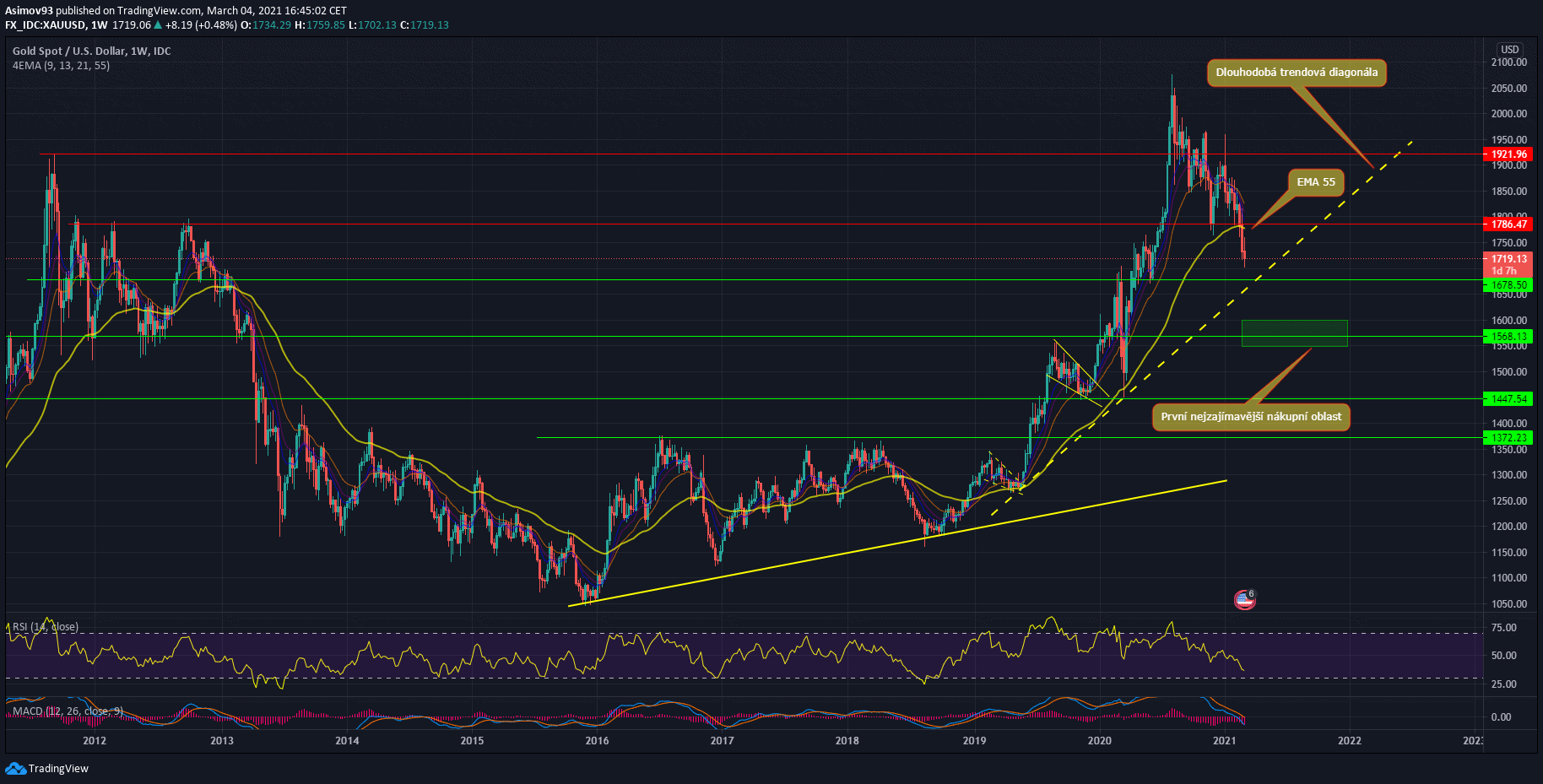 Nyní si ukážeme důležité technické úrovně na týdenním grafu, kdy nejbližší je S/R level 1 678 USD/unce, ale nejlákavější nákupní oblast je až kolem S/R levelu 1 568 USD/unce. Z aktuální ceny by ovšem zlato muselo klesnout o dalších cca 9 %, což je zrovna na trhu se zlatem hluboký pokles.