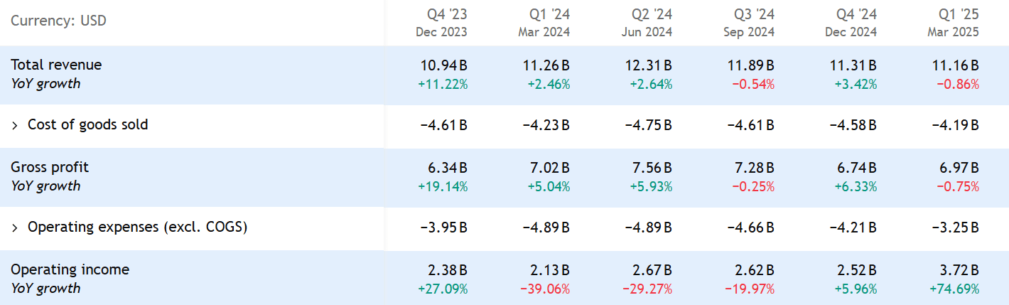 V prvním čtvrtletí 2025 se ale firmě nepodařilo dosáhnout růstu tržeb. Celkové výnosy klesly o 0,86 % a dosáhly 11,16 miliardy USD.