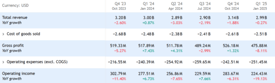 Kromě tržeb ale klesající firmě i zisky. Provozní zisk za 1Q 2025 klesl o 19 % a zisk na akcii se meziročně snížil o 22 %.