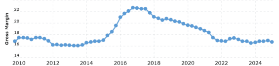 Zásadní pro ziskovost firem je vývoj hrubé marže. Ta u Hormel Foods klesá prakticky od roku 2017.