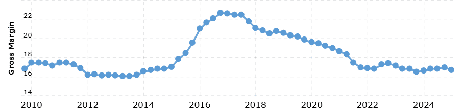 Tento neuspokojivý vývoj ceny akcií je dán výsledky společnosti. Firmě totiž od roku 2023 klesají tržby. Za 1Q 2025 výnosy klesly o 0,27 %, což samozřejmě není žádná tragédie, ale varující je pokles tržeb v delší časové řadě.