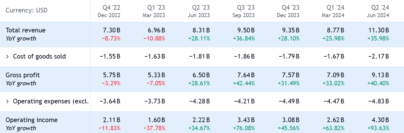Čtvrtletní tržby za 2. čtvrtletí 2024 Eli Lilly dosáhly 11,3 miliardy USD, což představuje 30% nárůst oproti předchozímu roku, přičemž k tomuto růstu přispěla i mezinárodní expanze.