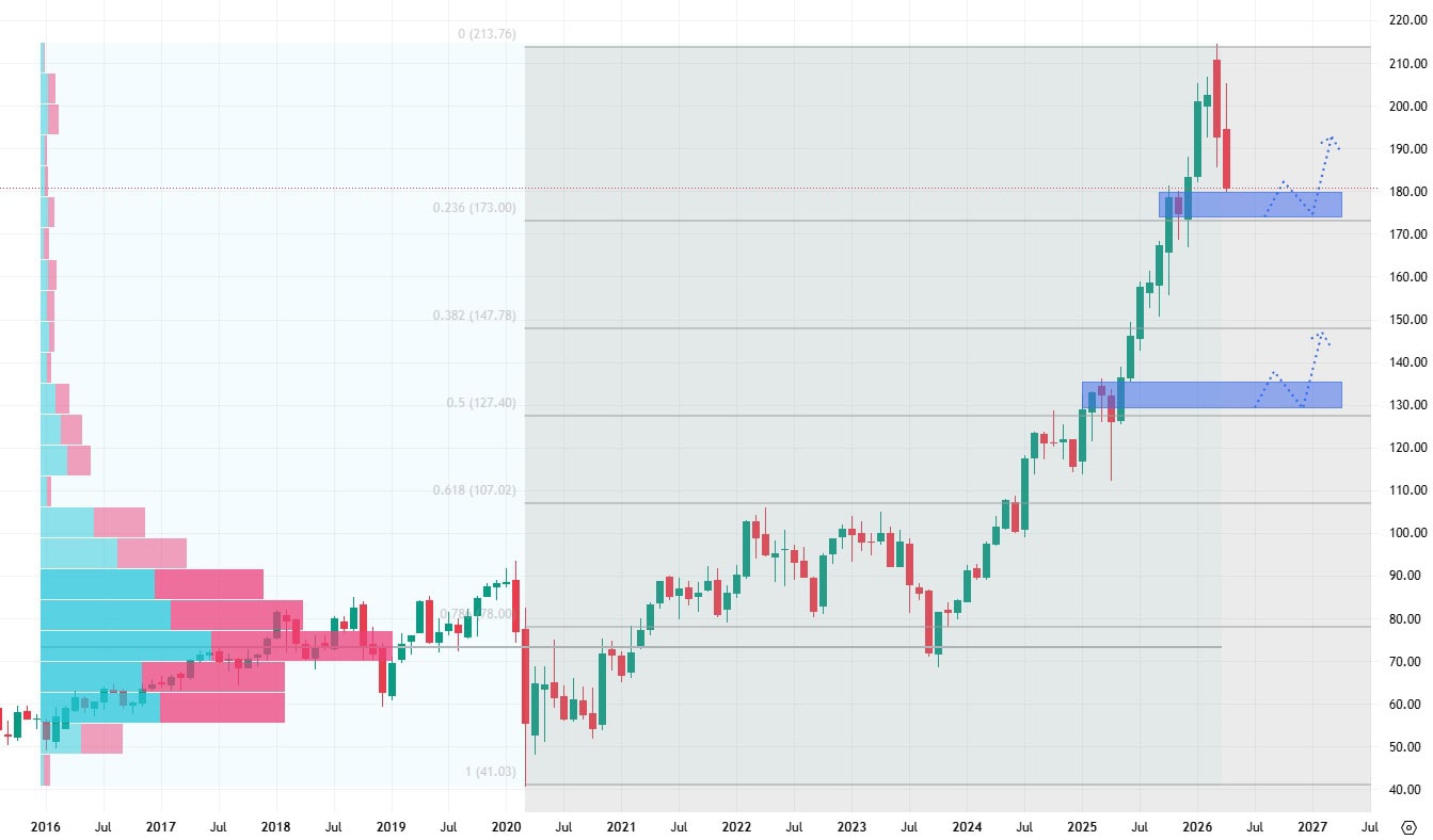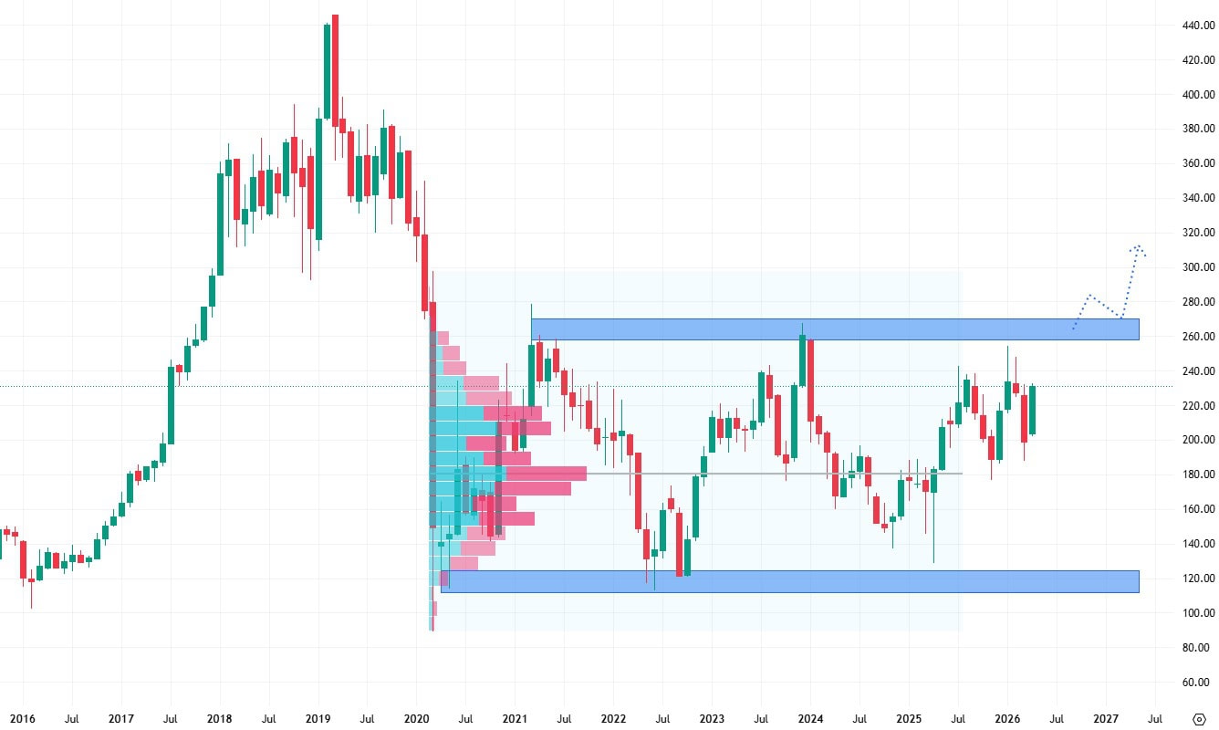 Akcie Boeingu se od roku 2020 pohybují v postranním trendu, který ovšem vykazuje poměrně vysokou volatilitu. Titul se aktuálně obchoduje pod rezistencí na 260 dolarech, ale bezpečně nad supportem okolo 120 dolarů.