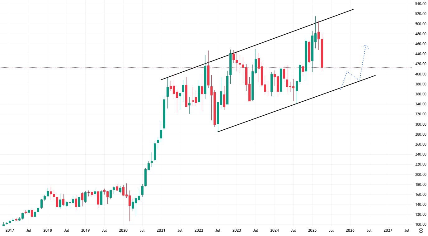 Akcie Deere & Company se obchodují od roku 2022 v rosícím trendovém kanále s tím, že nyní po testu jeho horní hrany dochází k cenovému poklesu. Nejbližší support je rostoucí trendová čára, která značí dno trendového kanálu.