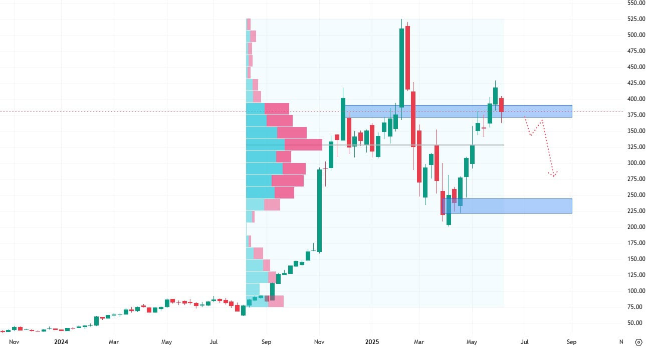 Akcie AppLovin se obchodují na hodnotě dlouhodobé rezistence s tím, že si procházejí menší prodejní korekcí. Pokud by došlo k zamítnutí vyšších cen, může to značit začátek cenového propadu až k supportu na ceně 220 USD.