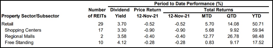 Letošní růst mezi maloobchodními REITs je v rozporu s konvenčními názory, které říkají, že je maloobchod mrtvý. Národní asociace realitních investičních trustů (Nareit) řadí 29 REIT do maloobchodní skupiny a uvádí, že k 12. listopadu dosahovaly dividendového výnosu 3,7 % a jejich celkový výnos od počátku roku činil téměř 51 % po mizerné 25% ztrátě v roce 2020. Společnost Simon Property Group celý segment výrazně překonala, když ve stejném období dosáhla zhodnocení 100 %, zatímco Federal Realty Investment Trust byl ke stejnému okamžiku v plusu 57 %.