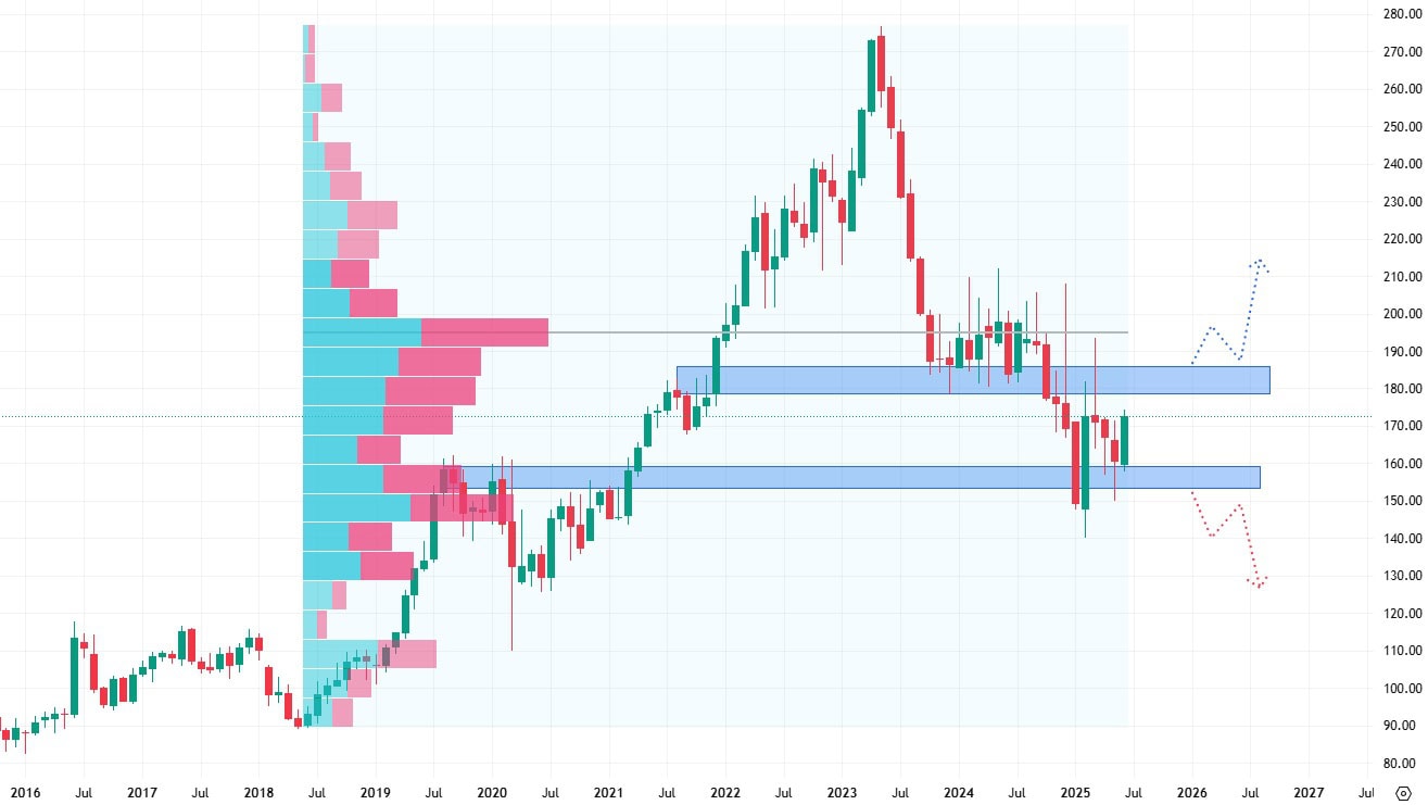 V současné době můžeme pozorovat cenový růst, kterému bude ovšem bránit rezistence na úrovni 180 USD.