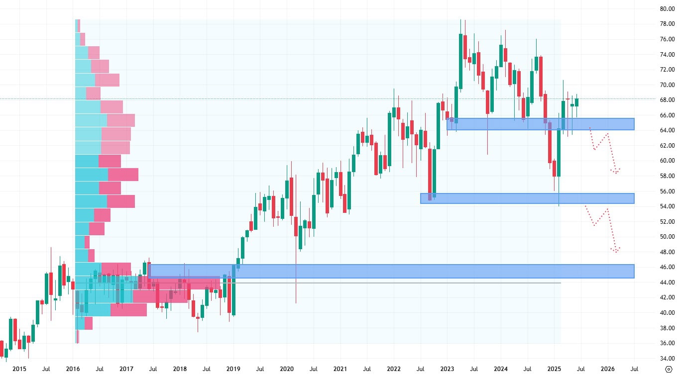 Akcie MDLZ se obchodují v rostoucím trendu, s tím, že se jim podařilo prorazit rezistenci na ceně 65 USD.