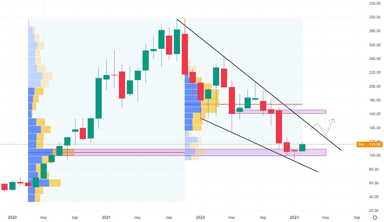Co se daří na poli podnikání, to se ovšem nedaří na poli akcií. CrowdStrike v loňském roce zažil jejich výrazný pokles, který byl možná nyní ukončen na hodnotě silného supportu. V pádu Akcie CrowdStrike zastavila cenová úroveň podpořená nejsilnějším volume. Pokud by se mělo hovořit o růstové náladě těchto akcií, musely by nejprve překonat hodnotu dolů mířící trendové čáry a ideálně také rezistentní zónu na ceně 170 USD.