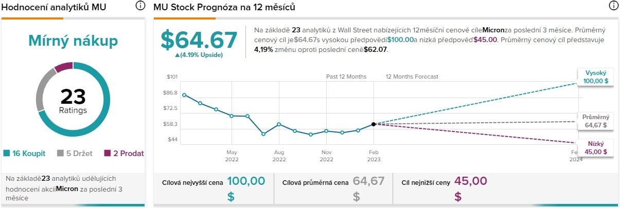 I u této společnosti se analytici shodují na akciovém růstu, který by měl podle optimistického scénáře dosáhnout ceny 100 USD, což by znamenalo dorovnání současných cenových maxim. Pouze dva analytici očekávají pokles akcií a to na hodnotu 45 USD, což by znamenalo riziko breakoutu současného supportu a nasměrování akcií Micron Technology do negativního sentimentu.