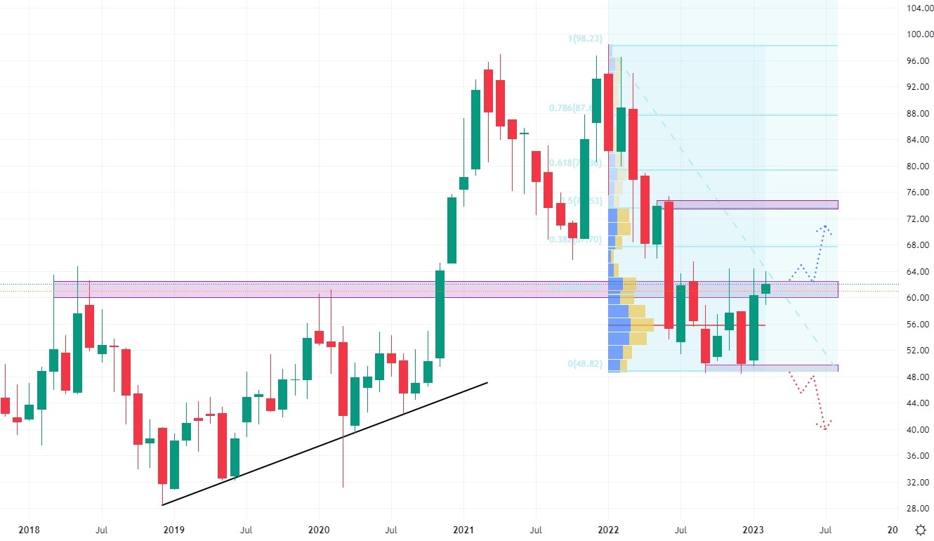 Akcie Micron Technology se od začátku letošního rou obchodují v postranním trendu, jehož prolomení by znamenalo pád na nižší cenové úrovně, které jsou ovšem typické absencí supportních zón. Z horní hrany postranního trendu je trh v růstu limitován silnou rezistencí, jejíž prolomení by naopak znamenalo cestu na vyšší ceny.