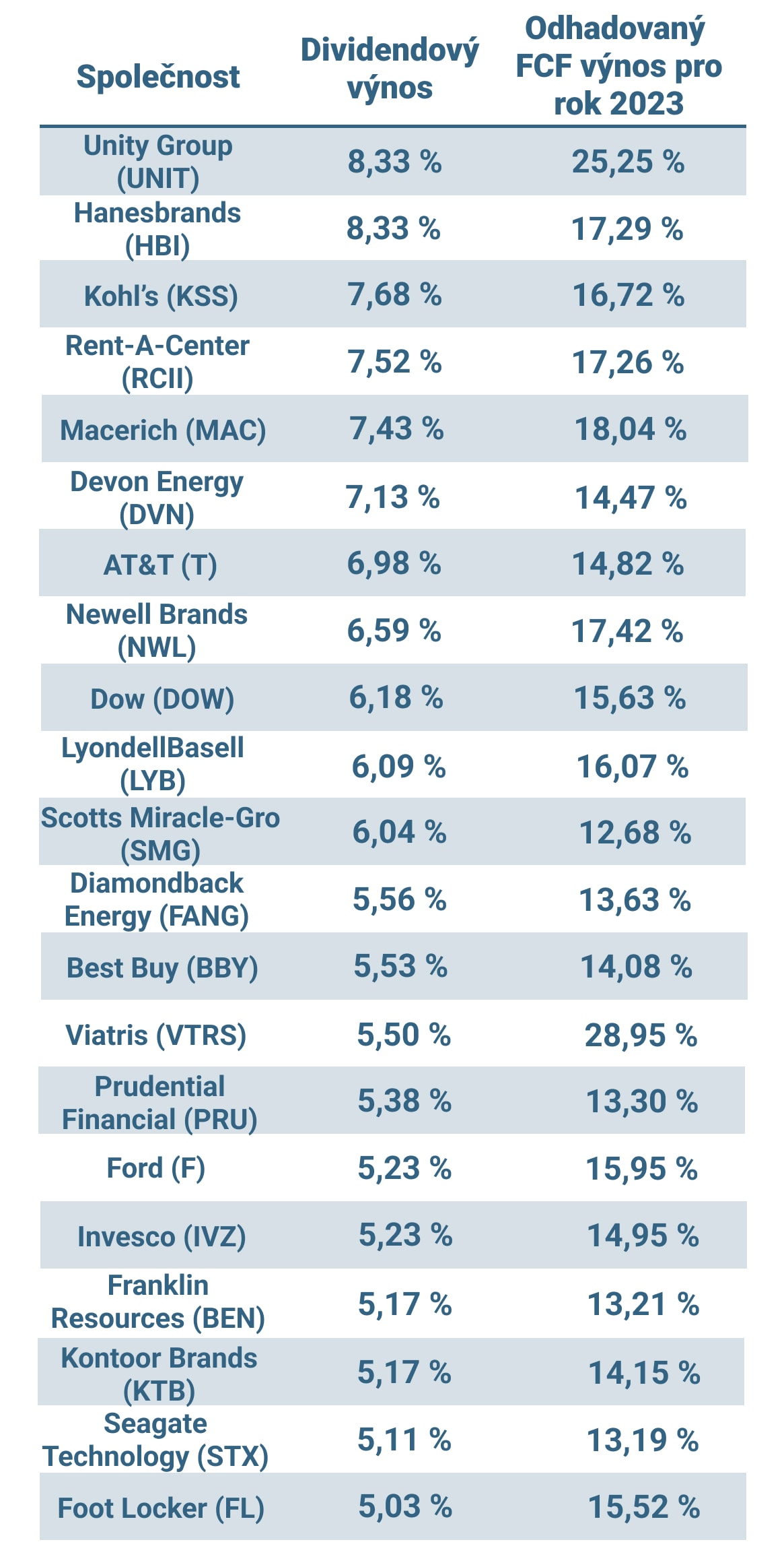 Níže tak naleznete 21 společností, které prošly screeningem, s dividendovým výnosem alespoň 5 % a odhadovaným FCF výnosem v roce 2023, který je alespoň dvojnásobkem současného dividendového výnosu. Jednotlivé společnosti jsou seřazeny podle dividendového výnosu: