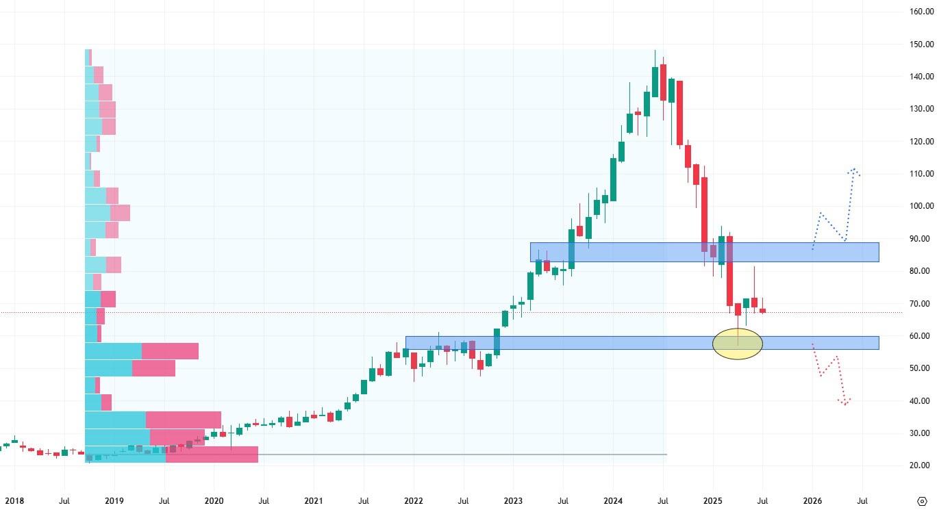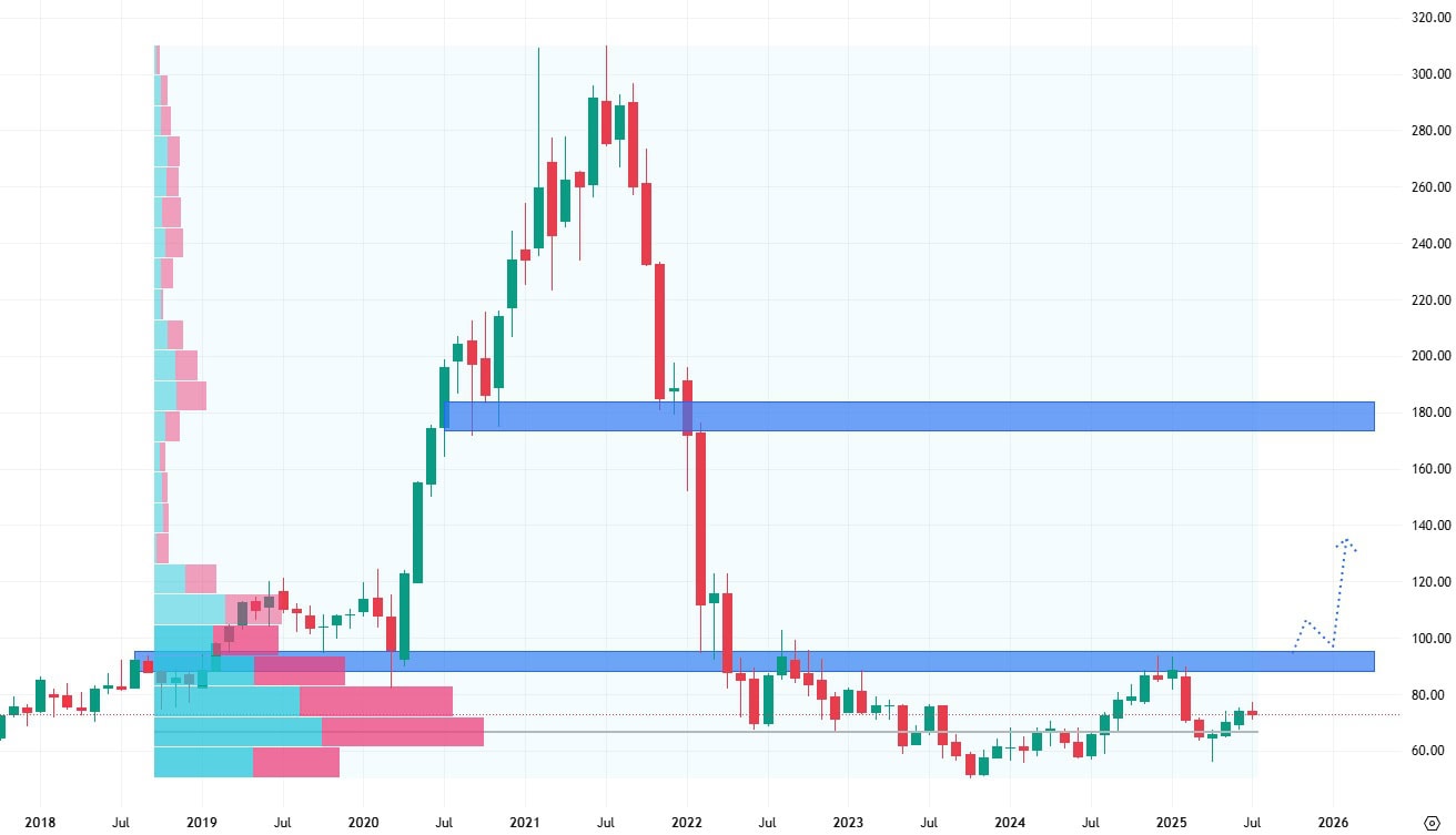 Pokud by akcie prorazily rezistenci na ceně 90 USD za akcii, měly by výrazný potenciál se opět vrátit na svá předchozí cenová maxima. Pokles ceny akcií pod support na 60 USD by znamenal pokračování cenového poklesu.