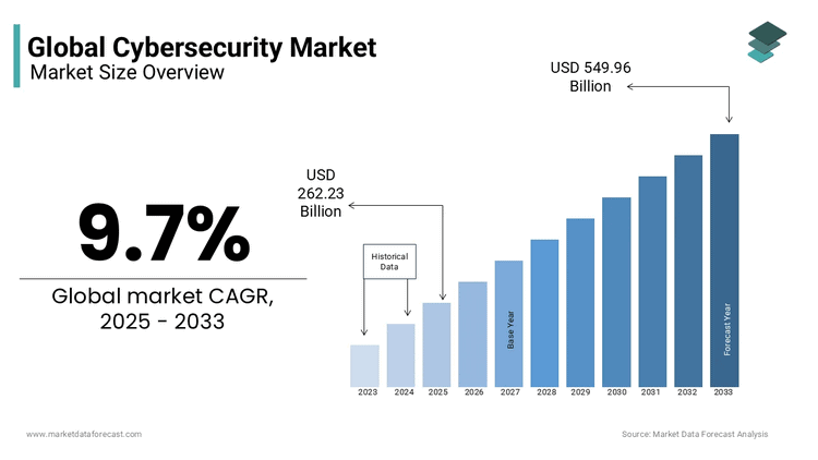 Růst globálního trhu s kybernetickou bezpečností v průběhu let spolu s predikcí.