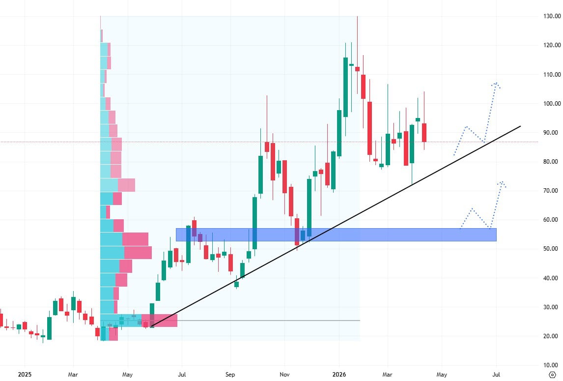 Při případném poklesu ceny pod trendovou čáru se nejbližší support nachází okolo hranice 55 USD. Ta představuje cenové minimum posledního růstového pohybu.