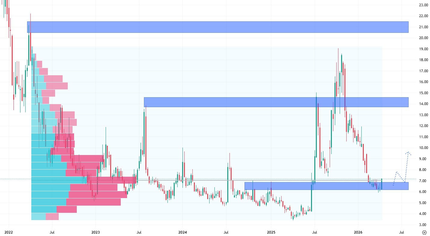 Pokud by support nezafungoval, cena může klesnout až do pásma dlouhodobé konsolidace s průměrnou cenou okolo 4 USD. Případný odraz by naopak znamenal návrat k vyšším hodnotám.