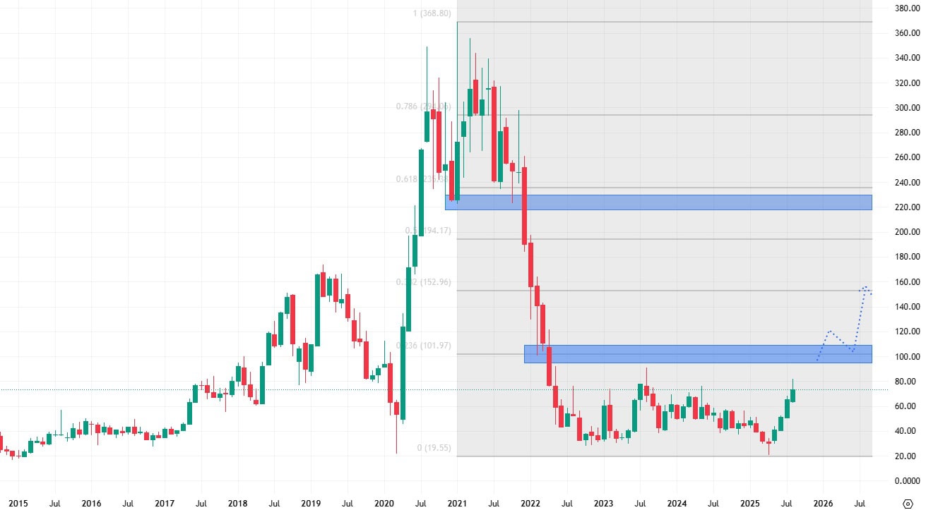 Akcie Wayfair se od roku 2022 obchodují v postranním trendu, ale po testu jeho spodní hrany prozatím rostou. Potenciál růstu mají akcie až na hodnotu nejbližší rezistence a to na 100 USD.