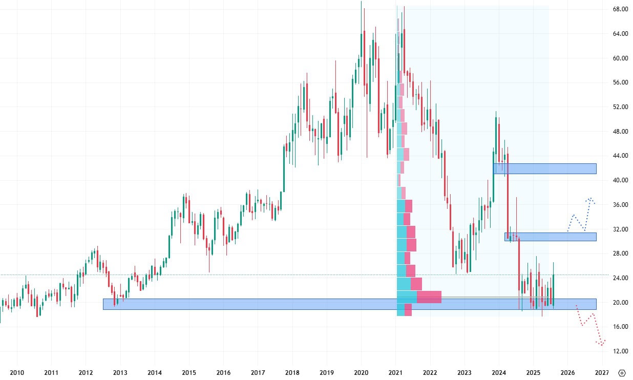 Další nevýhodou je, že akcie nemají až do cenové úrovně okolo 25 USD téměř žádnou výraznou supportní úroveň, což může být v případě agresivního cenového poklesu problém.