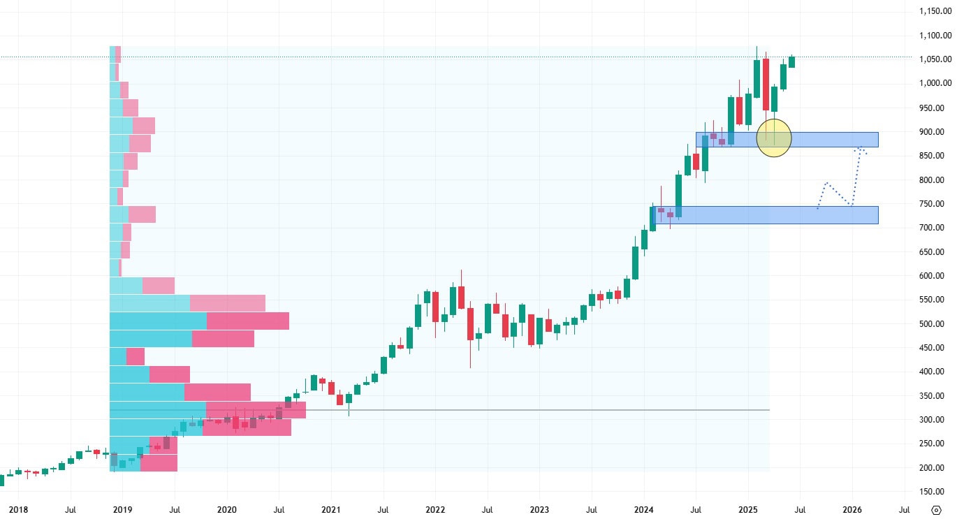 Nejbližší support je u těchto akcií také již otestovaný, což by v případě prodejní korekce mohl být problém. Další support se totiž nachází až na ceně 750 USD za akcii, což je již vzdálená meta od současné ceny.
