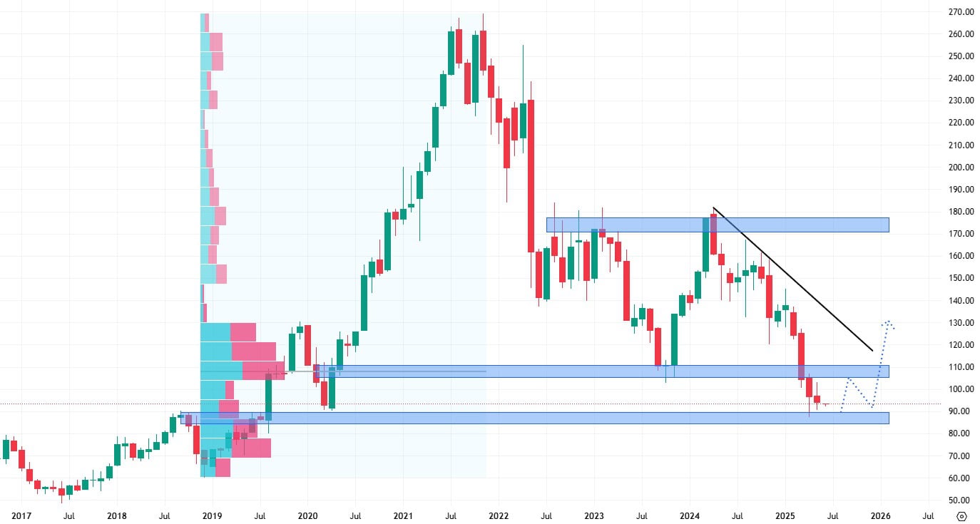 Naopak, pokud by akcie začaly růst, mají na vyšších cenových úrovních poměrně hodně rezistencí. Tou nejbližší je cenové dno na 110 USD a dále se jedná o klesající trendovou čáru, popřípadě low nákupní korekci na 130 USD za akcii.