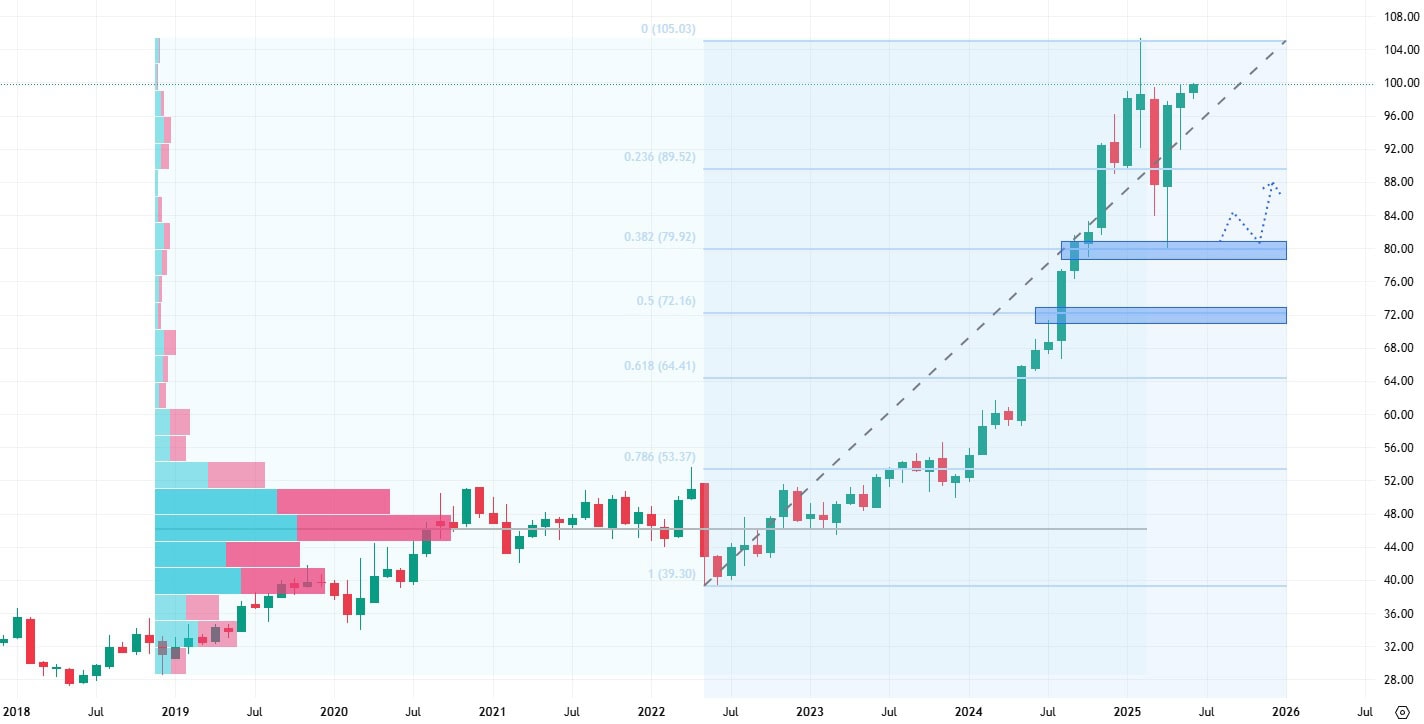 Pokud by akcie klesly pod hodnotu tohoto supportu, znamenalo by to alespoň krátkodobé ukončení růstového trendu. Tento scénář je ovšem méně pravděpodobný, protože akcie v současné době míří ke svým historickým maximům.
