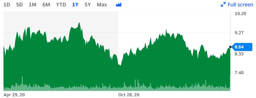 Vývoj ceny akcií Mobile TeleSystems za poslední rok. Zdroj: finance.yahoo.com