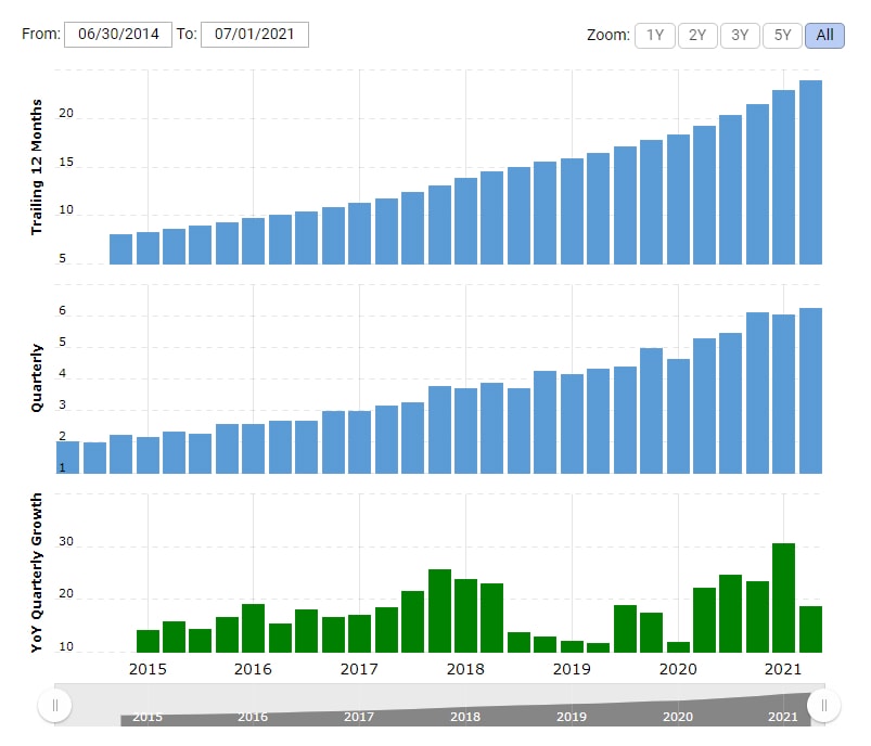 PayPal nyní začíná sklízet plody, které mu přináší miliony nových uživatelů, kteří se k platformě připojili během pandemie. Za poslední tři roky se počet transakcí na jeden účet zvýšil z 35,7 na 43,5 ročně. Od 3. čtvrtletí 2020 se přitom tento důležitý ukazatel angažovanosti zrychlil z 1% růstu na 11 % ve 2. čtvrtletí 2021.