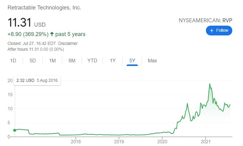 Retractable Technologies (NYSEMKT: RVP) je jednou ze společností, která na rozdíl od jiných vydělávala na pandemii. Jakožto lídr ve výrobě injekčních jehel se totiž stala nepostradatelným článkem v boji proti koronaviru, a to především díky vládě Spojených států.