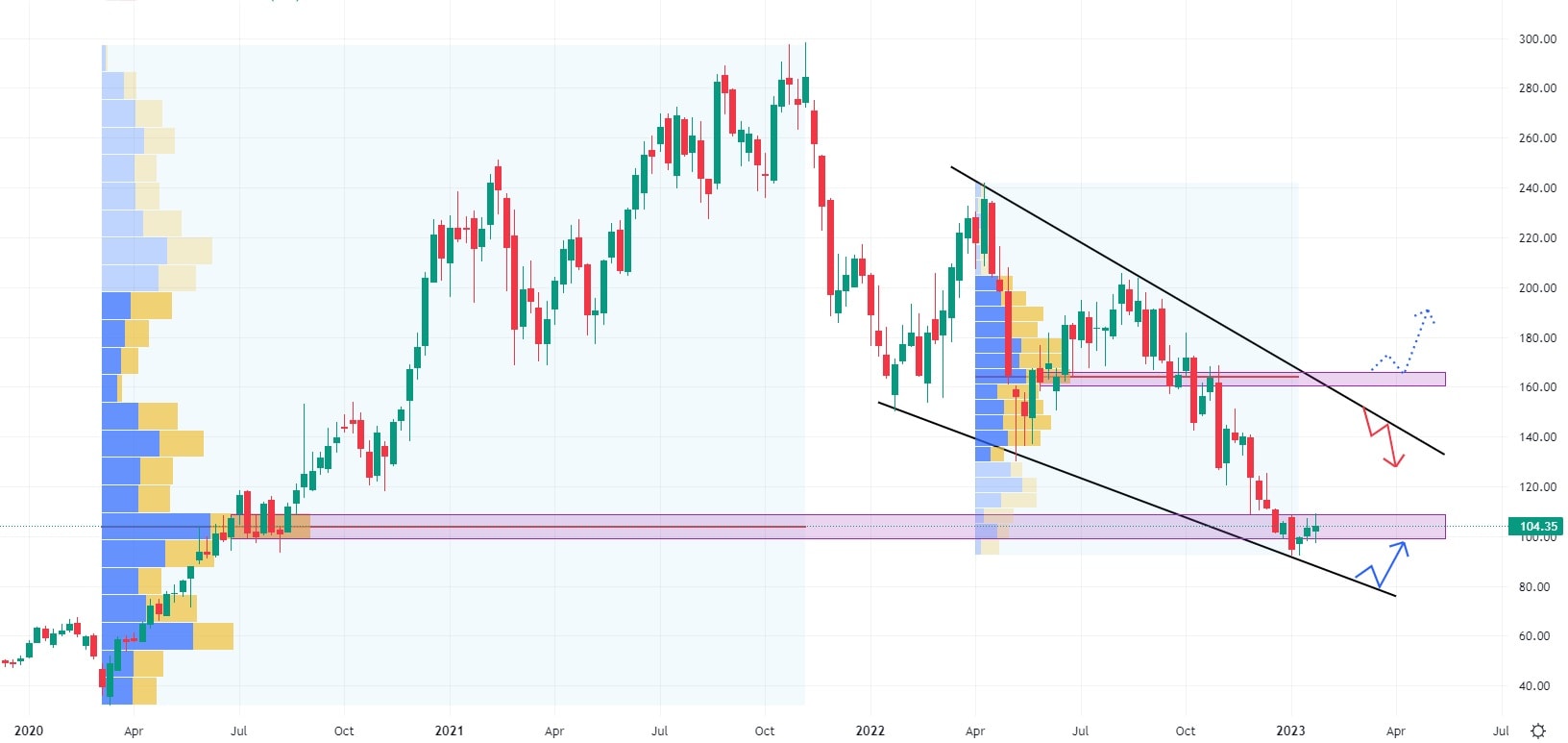 Akcie CrowdStrike se během loňského roku obchodovaly v klesajícím trendovém kanále. Ovšem začátkem nového kalendářního roku se pokles akcií zpomalil, což souvisí s tím, že trh právě testuje supportní zónu z roku 2020. I v tomto případě existuje zajímavý potenciál zhodnocení, protože trh může dosáhnout 54% růstu, než bude testovat nejbližší rezistenci, kterou tvoří konfluence mezi klesající trendovou čárou a silnou volume oblastí.