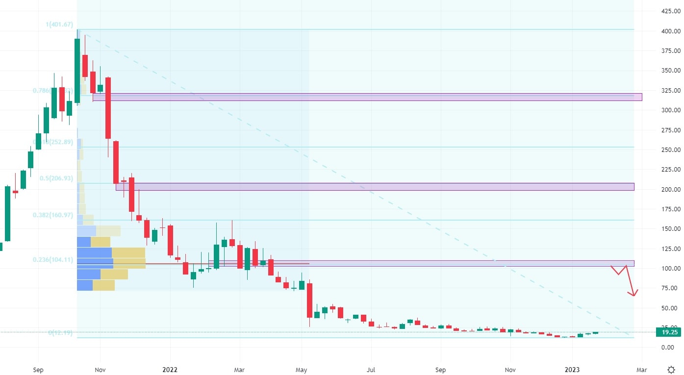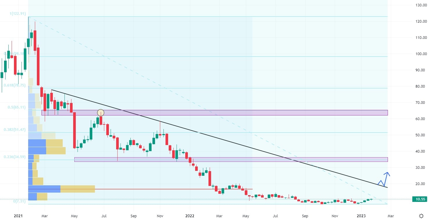Ani akcie Fastly neunikly loňskému medvědímu trhu, který srazil hodnotu jejich akcií na samotná minima. Klesající trend se držel pod úrovní klesající trendové čáry, která bude plnit roli první technické rezistence v případě akciového růstu. Pokud bude trendová čára trhem testována, bude to značit růst akcií o 90 %. K hodnotě další rezistence, kterou tvoří výrazné volume, to značí potenciál růstu 210 %.