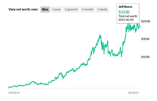 Růst jmění Jeffa Bezose od dubna 2012 do června 2021. Zdroj: Bloomberg.com