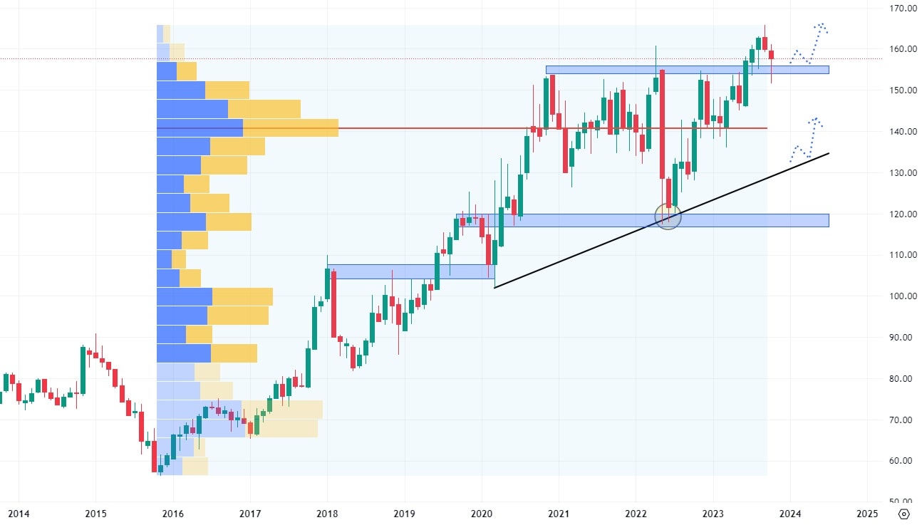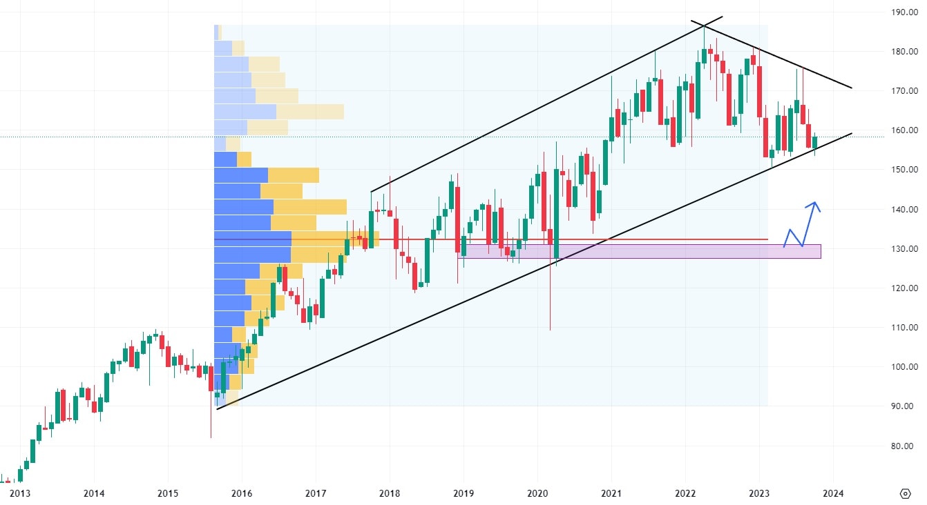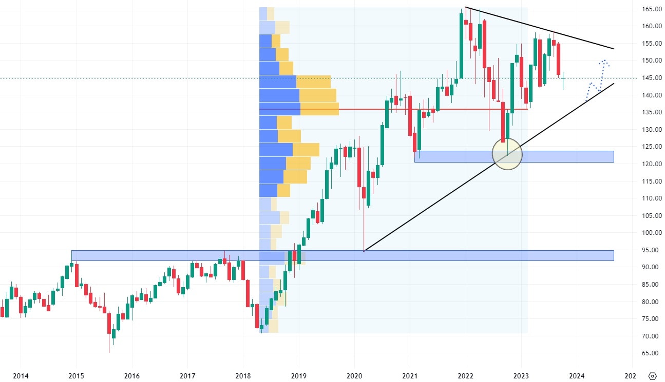Akcie Johnson & Johnson, této známé zdravotnické společnosti, jsou v kleštích dvou trendových čar. V cenovém růstu trhu brání klesající trendová čára a naopak její růst podporuje rostoucí trendová čára. Tato situace obvykle skončí agresivním breakoutem na jednu, či druhou stranu. Nejbližší support, v případě cenového poklesu, se nachází na hodnotě 130 USD za akcii, kde level koreluje s největším volume, kumulovaným mezi lety 2017 – 2020.