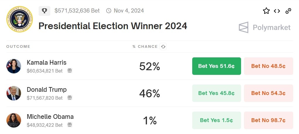 Právě prezidentské volby v USA jsou tím, co Polymarket tento rok proslavilo. U hlavní sázkové příležitosti na vítěze voleb už bylo vsazeno přes 570 milionů USD, což je číslo, která analytici ani média nemohou ignorovat, a tak se Polymarket stává častým zdrojem informací a z nich vycházejících predikcí.