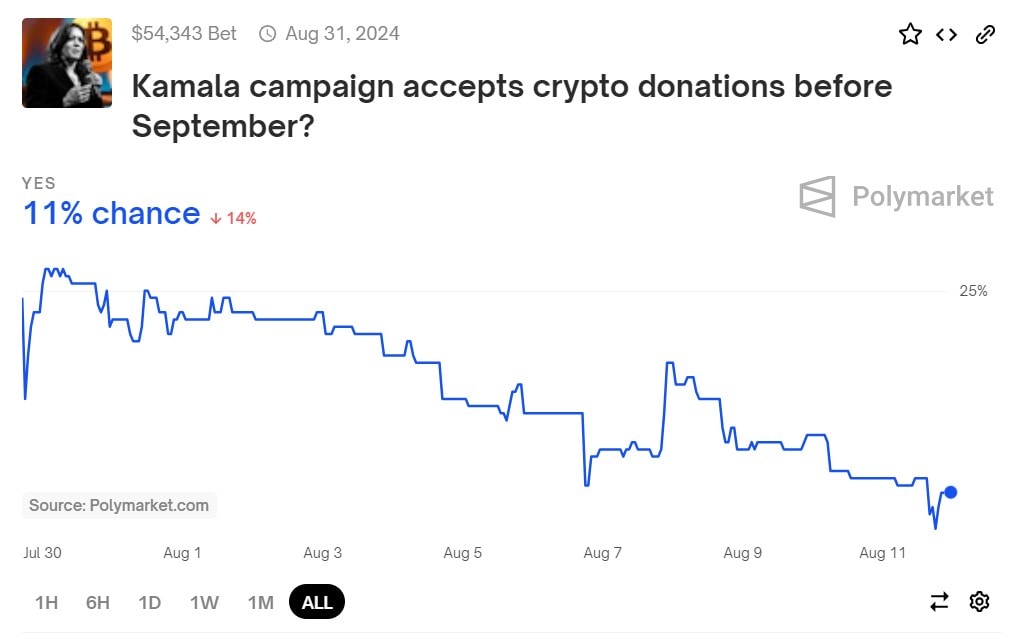 Polymarket však potěší i sázející (nebo je lepší jim říkat obchodníci?), kteří vyhledávají nevšední sázkové příležitosti. Tak například si lze vsadit na to, zda kandidátka a současná viceprezidentka Harrisová začne přijímat kryptoměny jako možnost podpory své kampaně.