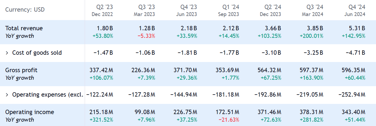 Ve čtvrtém čtvrtletí fiskálního roku 2024 vykázala Supermicro tržby ve výši 5,31 miliardy dolarů, což představuje meziroční nárůst o 142 %. Pro první čtvrtletí fiskálního roku 2025 společnost předpokládá tržby ve výši 6 až 7 miliard USD.