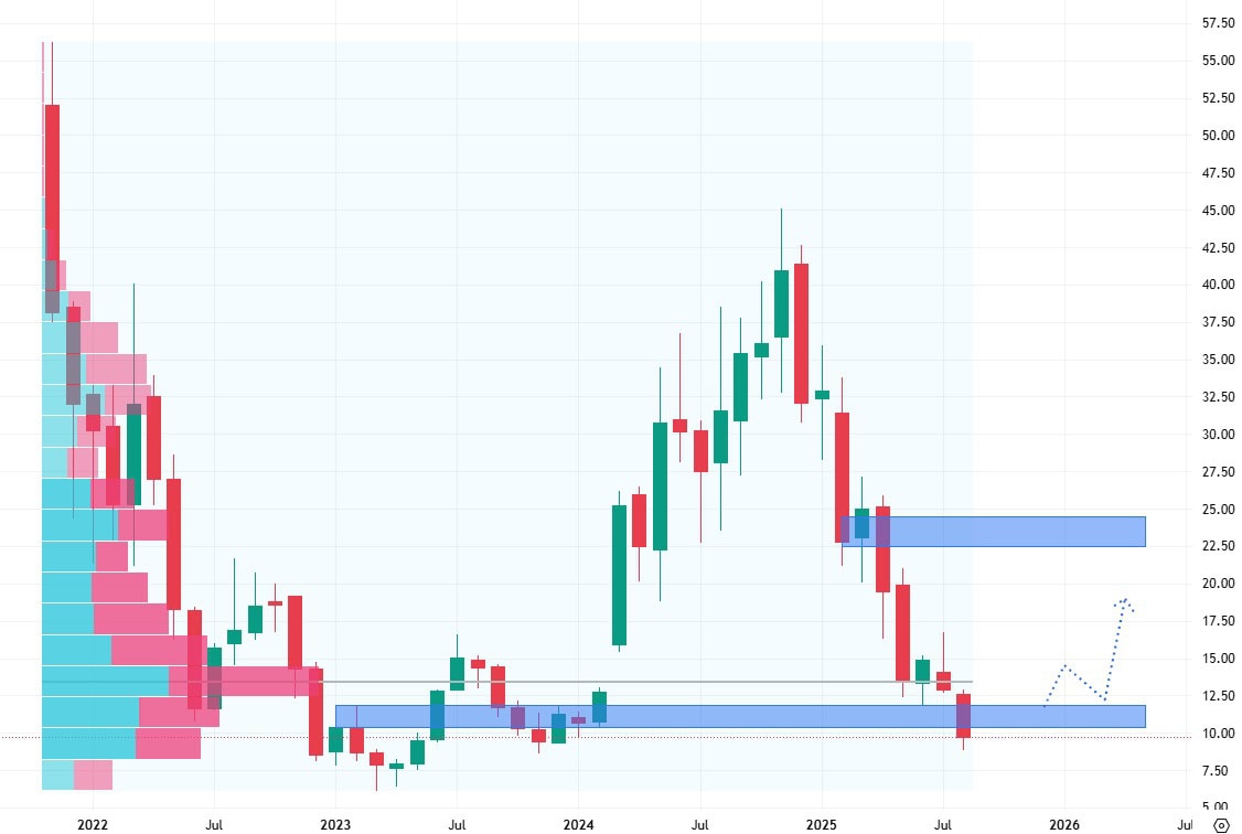 Akcie Sweetgreen se obchodují na svých cenových minimech a vypadá to, že prorážejí i hodnotu svého posledního supportu. Navíc se obchodují i pod hodnotou největšího volume, což je další případná bariéra pro cenový růst.