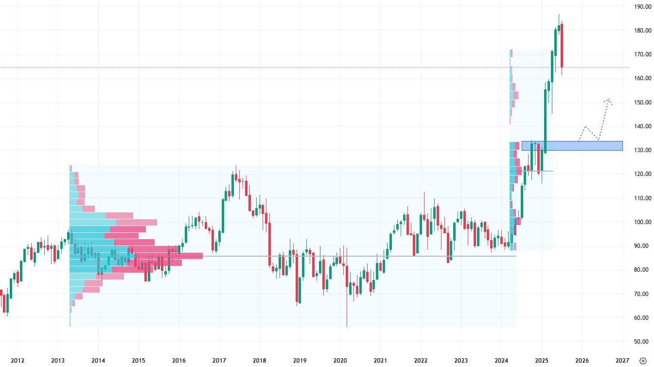Průrazem nejbližší rezistence návrat těchto akcií na vyšší hodnoty teprve začíná. Další bariérou bude hodnota klesající trendové čáry. Až poté se akciím otevře potenciál cenového růstu do oblasti výběžku na 180 USD za akcii.