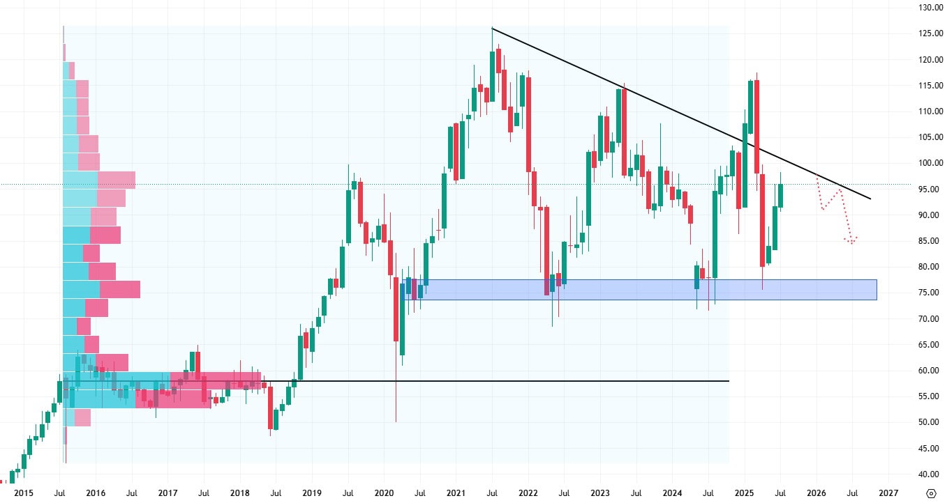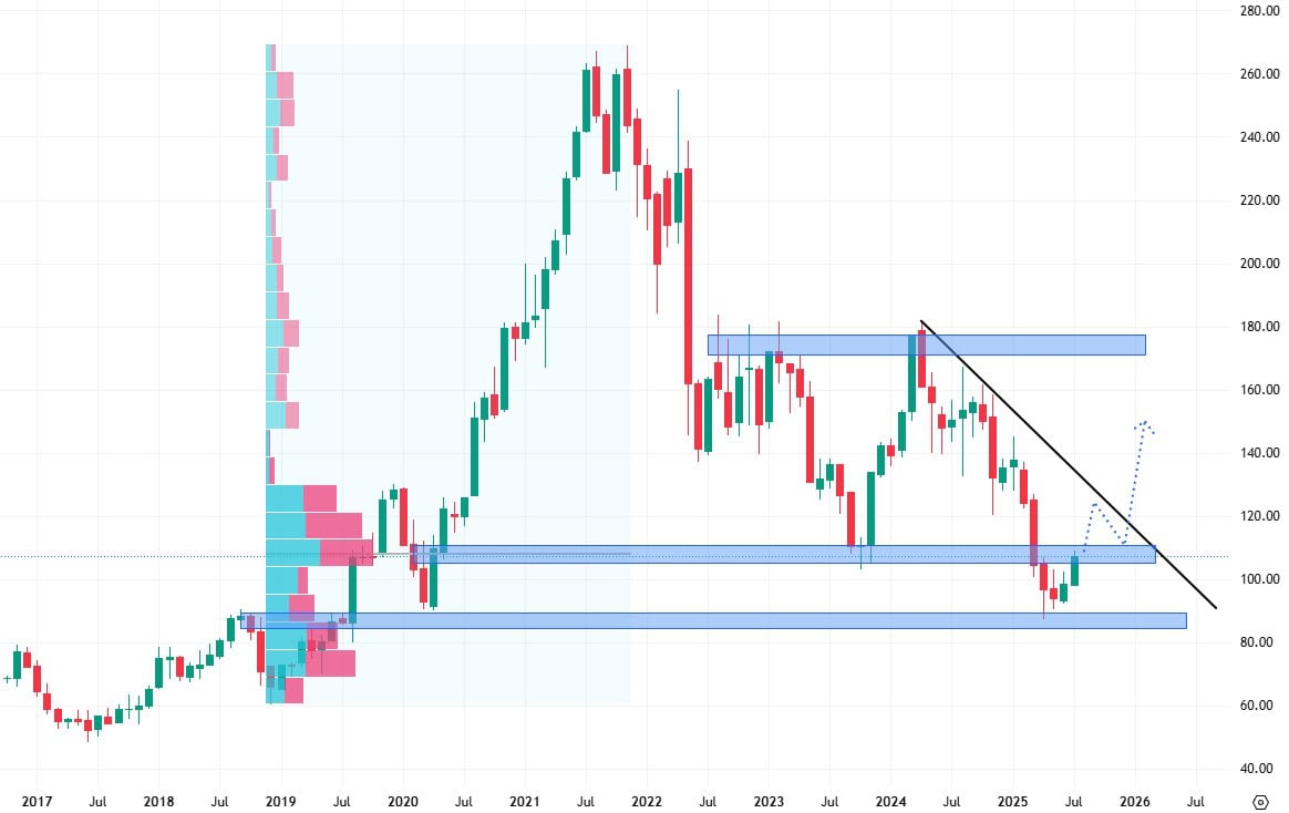 Akcie Target se sice obchodují v klesajícím trendu, ale již můžeme pozorovat nákupní reakci na důležitý support na ceně 90 USD. Akcie mají nyní před sebou rezistenci z proraženého swingového low, kterou se jim zatím nepodařilo překonat.
